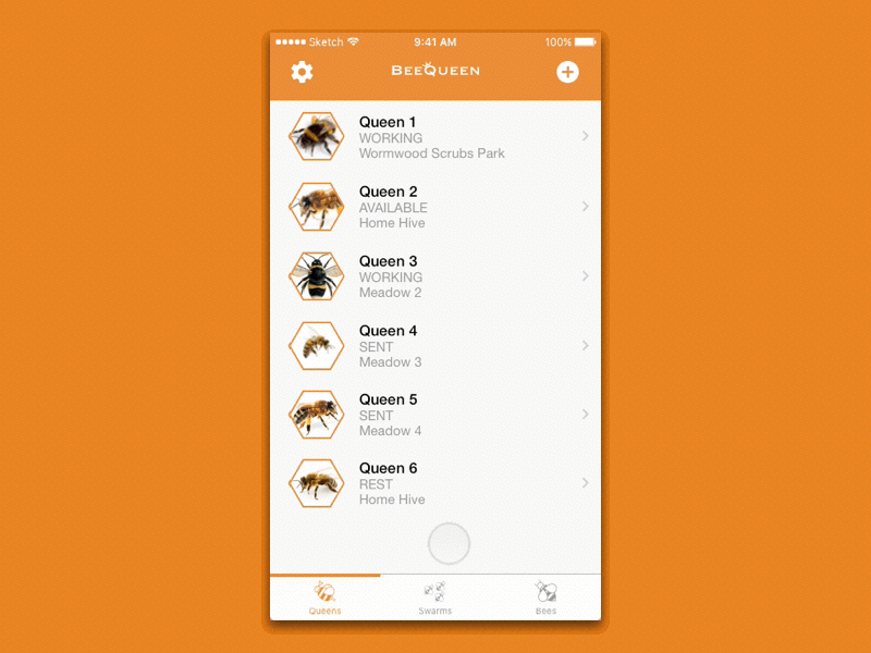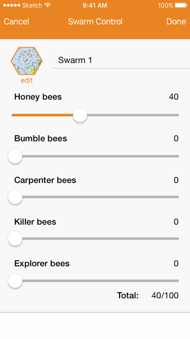 In the Swarm screen, you can add new bees to a swarm until a maximum of 100. You can select a different type of bees like honey bees or bumble bees. The clean and intuitive design helps the user to easily add and subtract bees.