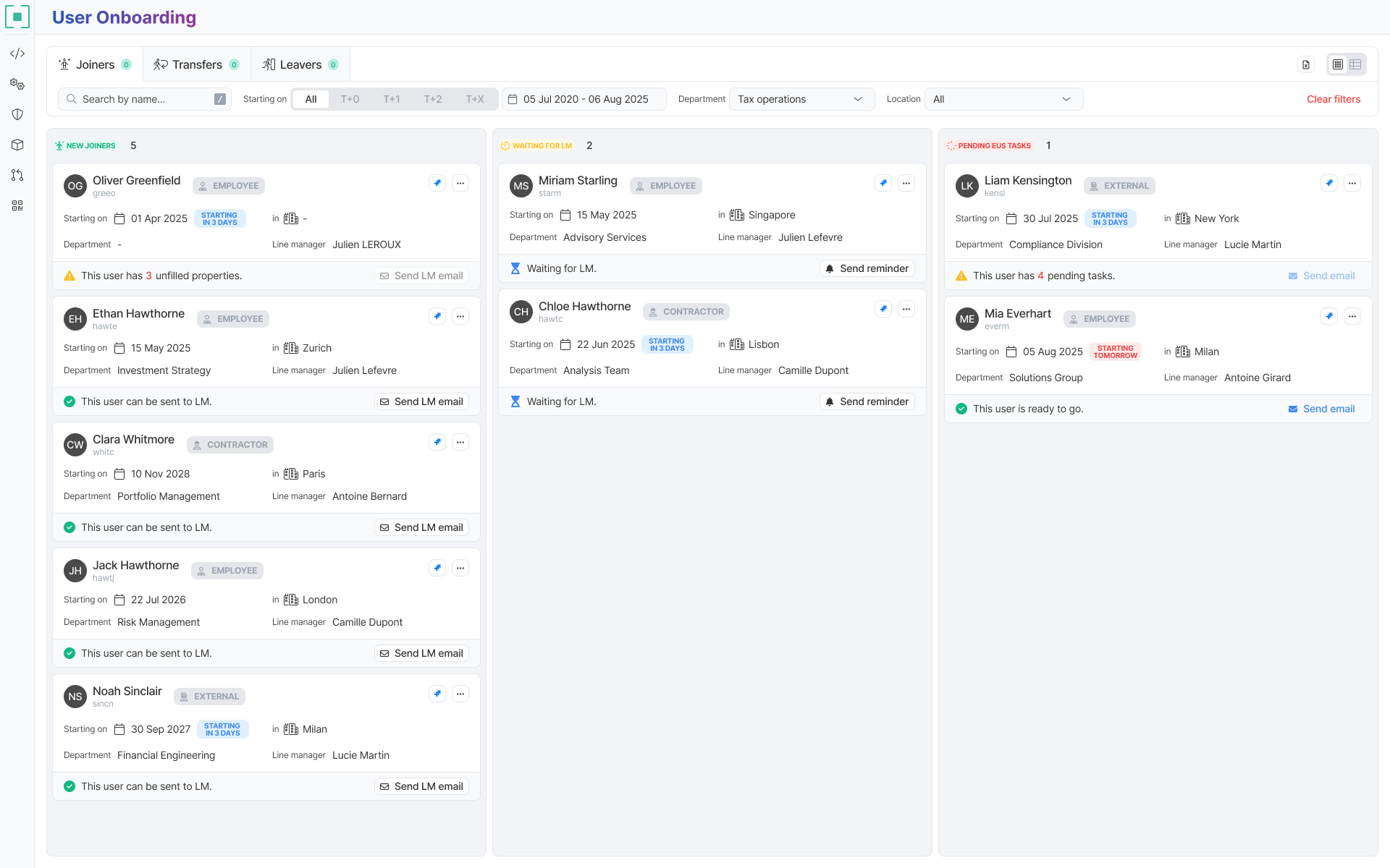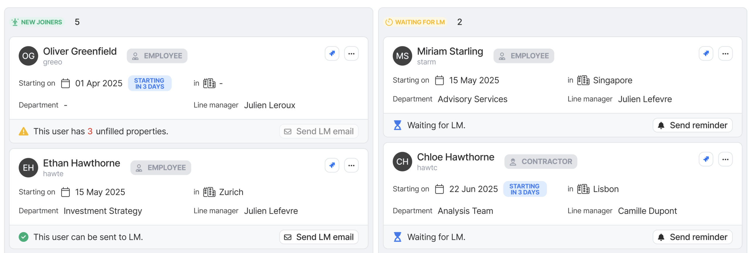 Each card shows key employee information including start date, location, department, line manager, and employment type (e.g. contractor, employee, external). Visual badges and labels help distinguish roles and highlight time-sensitive actions.